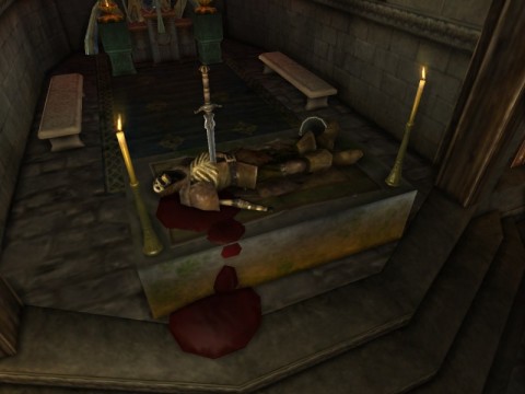 Items Used: 2 White Candlestick, 1 Sword, 1 Worn Knotwork Rug, 1 Rogue's Skeleton, 1 Stone Tomb, 1 Iron Cauldron, 5 Pink Urn