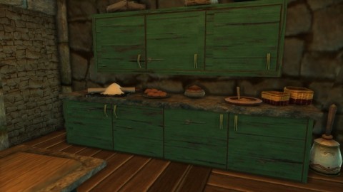 This set is for the upper cabinet as shown without any decorative elements. Materials: 3 Wood stair Landings, 3 Silver Steins, 4 Green Wood Planks, 8 Green Wood Tiles.