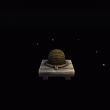 Bees fly around the hive.