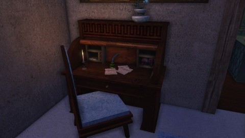 Set is for the desk as shown, minus decorations and chair. Materials: 1 Sword, 1 Mahogany Bookcase, 2 Potionmaker's Cabinets, 2 Mahogany Wood Poles, 1 Mahogany Wood Rectangle, 4 Dark Wood Discs, 5 Dark Wood Rectangles, 15 Dark Wood Planks. Set needs to be slightly inset into a wall, and should be on a ground floor due to length of desk legs.